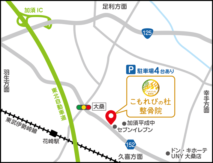 さいたま栗橋線の「東大輪交差点」から県道152号線に入っていただき直進(約7分) 平成中学校の先に在ります。