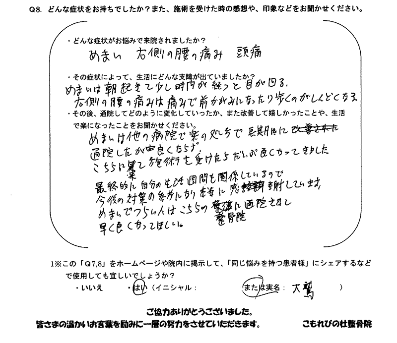 「めまい」「右側の腰の痛み」「頭痛」で悩んでいました。