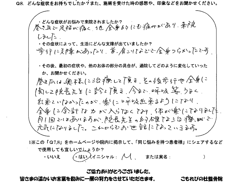 「巻き爪」を院長先生の奥様に治療していただき、その後、正しい歩き方の指導や全身のつらさに関して院長先生に診ていただきました。