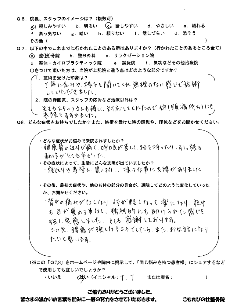 この先、腰痛が強くなるようでしたら、またお世話になりたいと思います。(T.T様 女性 50代)