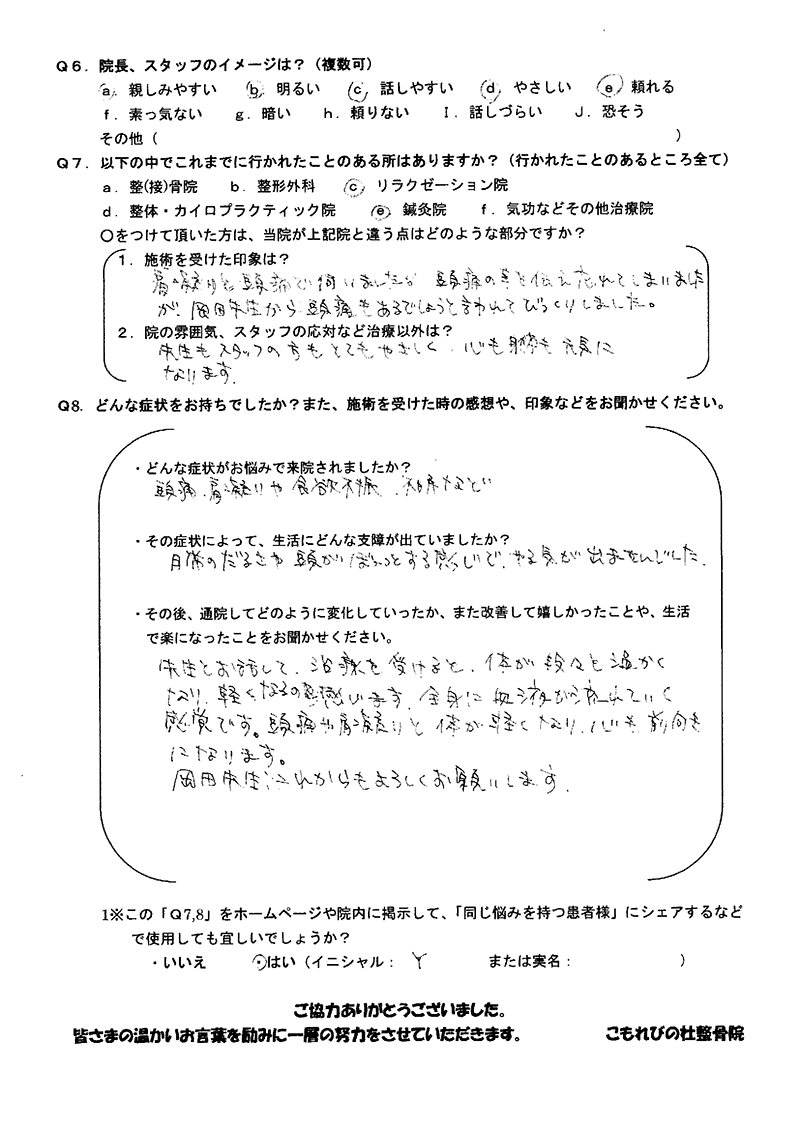 初診の際に、肩こりと頭痛で伺いましたのに「頭痛」のことを伝え忘れてしまいましたが、岡田先生から「頭痛もあるでしょう」と言われびっくりしました。