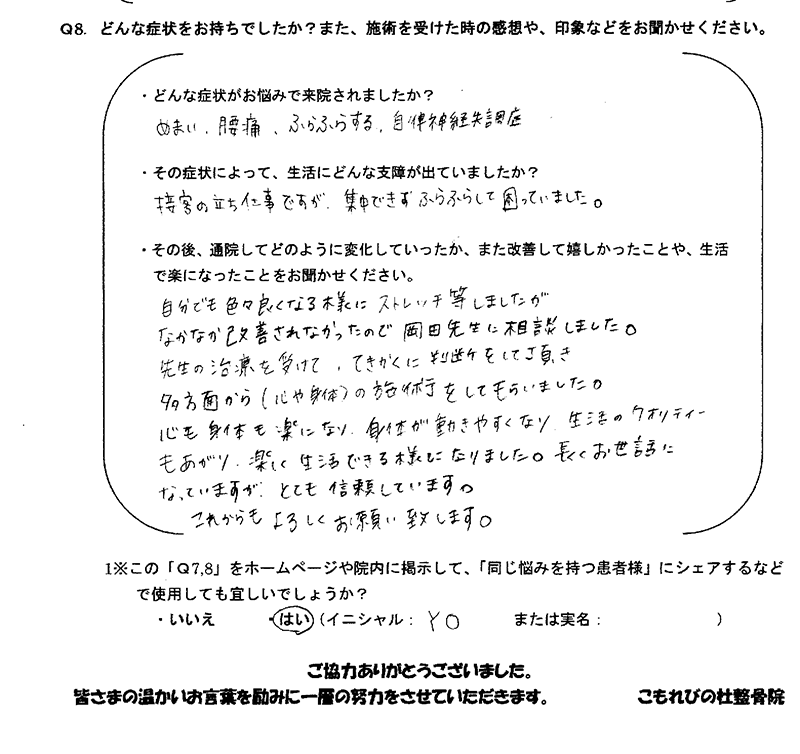 「めまい」は、他の病院で薬を処方してもらい長期間通院しましたが良くならず、こもれびの杜整骨院さんで施術を受けたらだいぶ良くなりました。